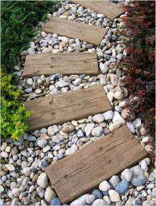 Bring different textures into your design, grass, textured paving, different surfacing under individual play pieces, (sand, wood chip, grass matting) wooden tree slices, tree trunks, boulders etc …